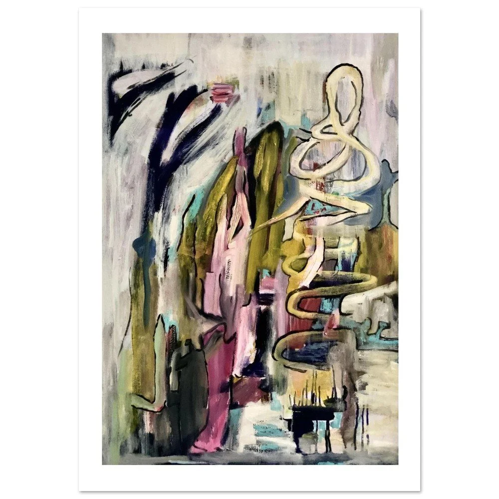 The original "Coils of Unspoken" painting arrived in one long exhale—oil on antique handwoven linen from around 1900 (100 × 70 cm), the surface already carrying its own quiet stories before the first stroke. I didn't plan the spirals; they rose instinctively from the canvas like something long held back finally twisting free. Layers of gray, pink, yellow, green, and deep blue collide and blur, thick impasto marks catching light where the coils loop and rise—fragile, insistent, alive. This is not decoration. It's the felt shape of what we bury: questions of control, silence that screams, energy that refuses to stay knotted.